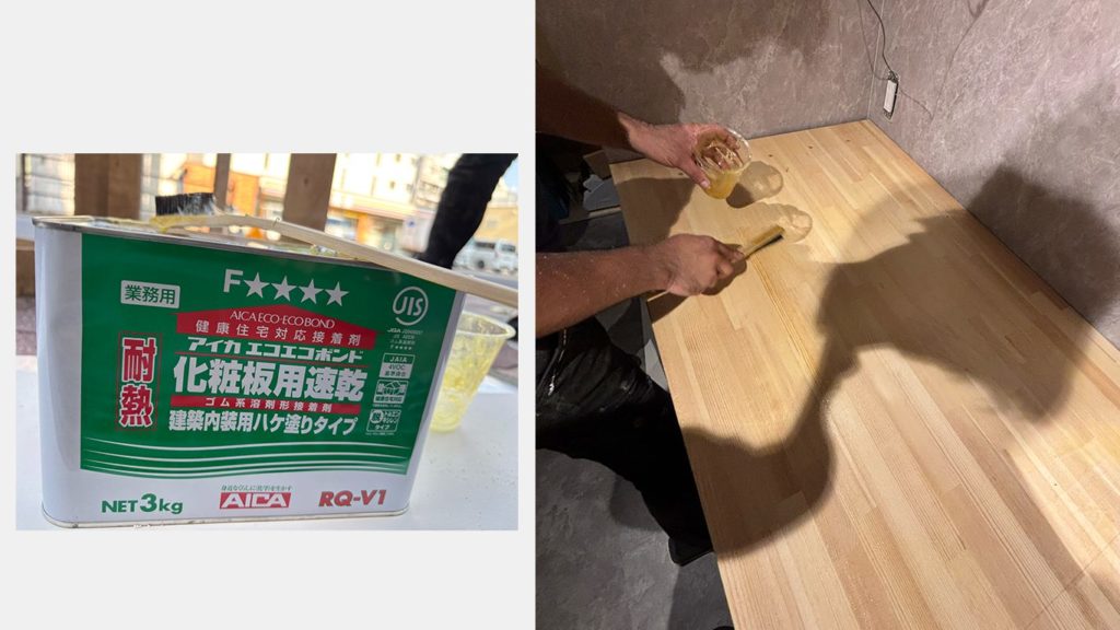 実際に家具の造作の際は、このメラミン化粧板を貼るのにアイカのエコボンドを使って化粧板を使用します。