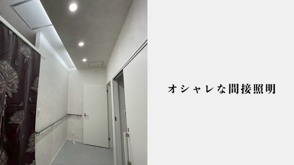 お風呂までの通路やトイレの通路までもがラグジュアリーな雰囲気を出すために間接照明を設計しました。