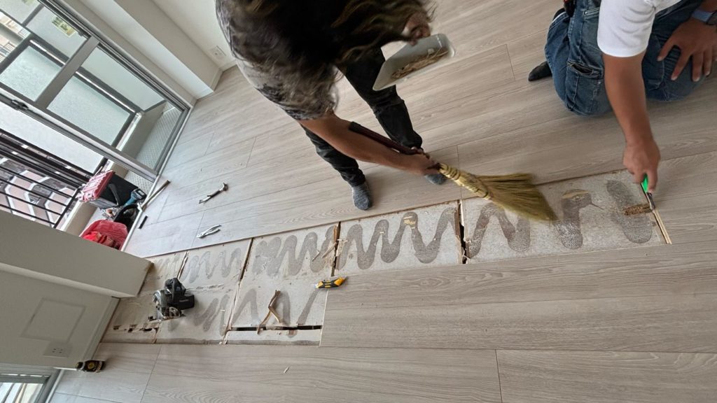 また、既存の床の後は補修が必須で下地補修をするために既存の下地にくっついているゴミを綺麗に撤去と掃除を行います。