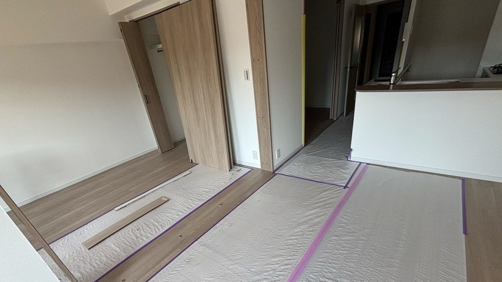 まず、建築の基本は養生から始まるので室内を養生しています。