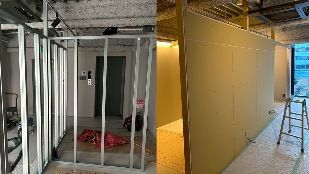 今回もまた内装制限や防火の関係上、間仕切りやボードには同様の使用が求められるのでLGS下地とボードを使用しています。