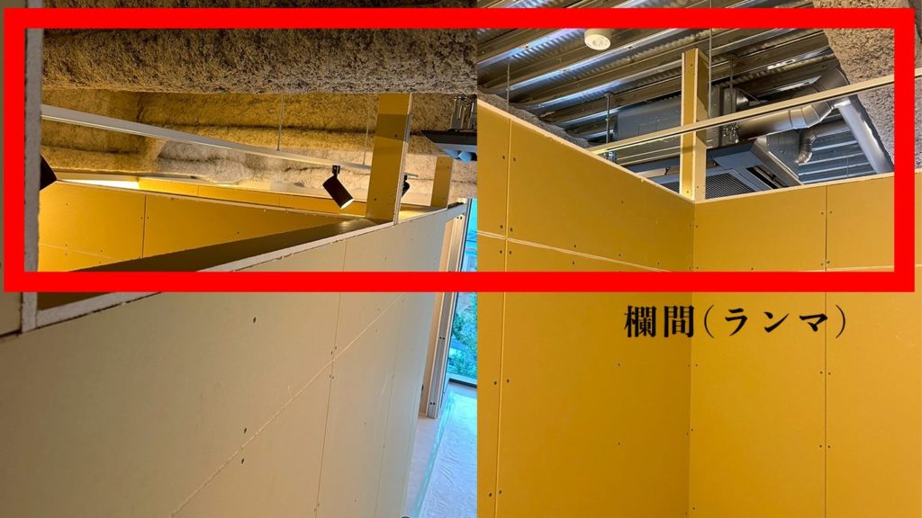 上の空間は、防災工事対策に欄間(ランマ)を上部に設置して自動火災報知器の増設や、防災工事の対象にならないようにしています。